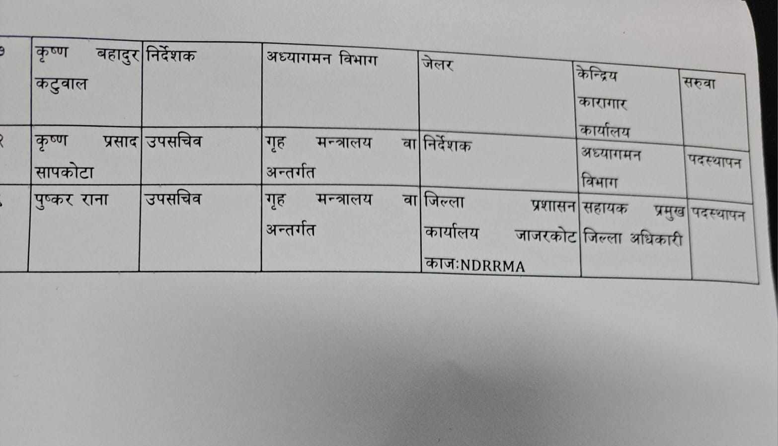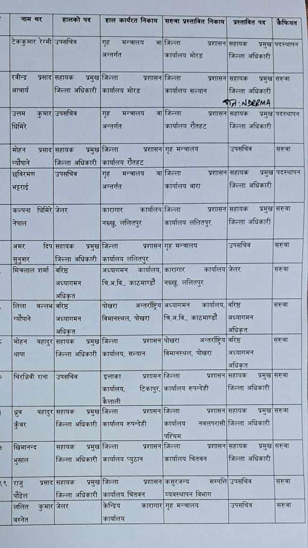 सरुवा हुनेमा सातजना सहायक प्रमुख जिल्ला अधिकारी, दुईजना जेलर, दुईजना वरिष्ठ अध्यागमन अधिकृत, ६ जना उपसचिव र एक अध्यागमन विभागका निर्देशक छन्।