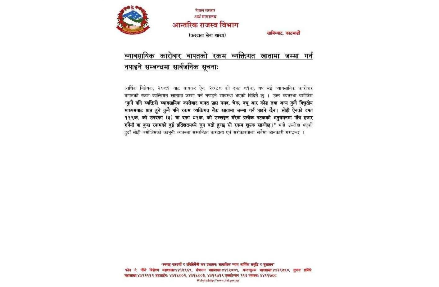 आर्थिक ऐन २०८१ ले गरेको व्यवस्था अनुसार आन्तरिक राजस्व विभागले व्यावसायिक कारोबार बापतको रकम व्यक्तिगत खातामा जम्मा नगर्न सूचना जारी गरेको छ ।