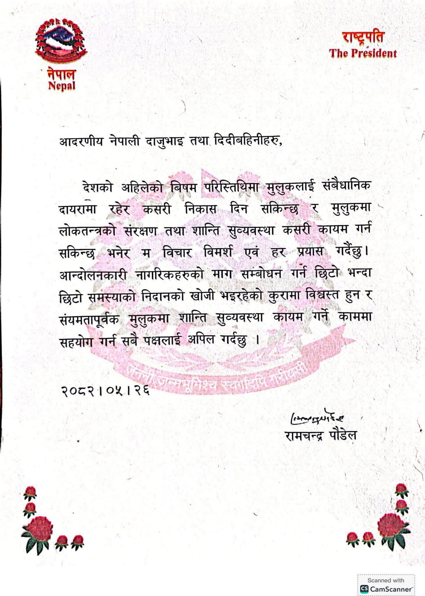 ‘आदरणीय नेपाली दाजुभाइ तथा दिदीबहिनीहरु, देशको अहिलेको बिषम परिस्थितिमा मुलुकलाई संवैधानिक दायरामा रहेर कसरी निकास दिन सकिन्छ र मुलुकमा लोकतन्त्रको संरक्षण तथा शान्ति सुव्यवस्था कसरी कायम गर्न सकिन्छ भनेर म विचार विमर्श एवं हर प्रयास गर्दैछु । आन्दोलनकारी नागरिकहरुको माग सम्बोधन गर्न छिटो भन्दा छिटो समस्याको निदानको खोजी भइरहेको कुरामा विश्वस्त हुन र संयमतापूर्वक मुलुकमा शान्ति सुव्यवस्था कायम गर्ने काममा सहयोग गर्न सबै पक्षलाई अपिल गर्दछु’ विज्ञप्तिमा भनिएको छ।