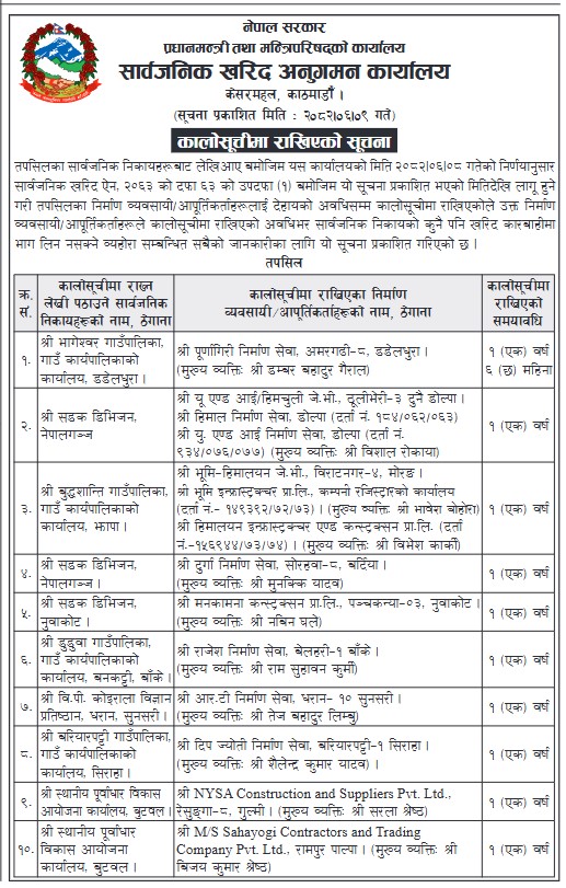 कार्यालयले आज सूचना जारी गर्दै विभिन्न निकायबाट कालो सूचीमा राख्नको लागि लेखि पठाएअनुसार ती निर्माण कम्पनीलाई कालो सूचीमा राखिएको जानकारी दिएको हो।