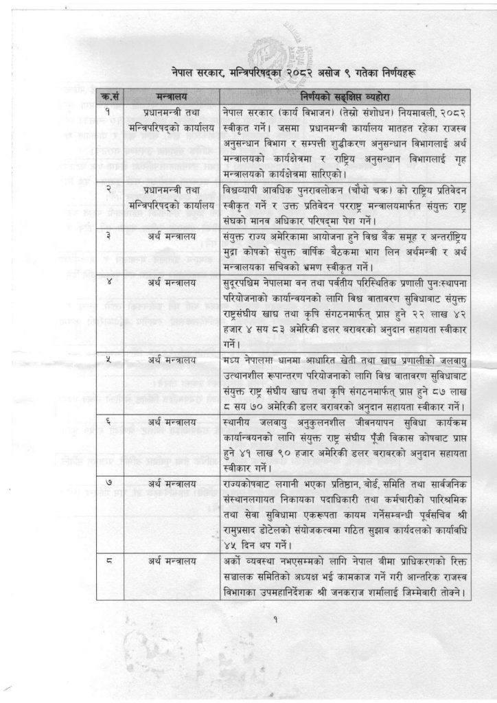 बैठकले राज्यकोषको लगानी रहेका प्रतिष्ठान, बोर्ड, समिति तथा सार्वजनिक संस्थानका पदाधिकारी र कर्मचारीको पारिश्रमिक तथा सेवा सुविधामा एकरूपता कायम गर्न पूर्वसचिव रामुप्रसाद डोटेलको संयोजकत्वमा गठन भएको सुझाव कार्यदलको कार्यावधि ४५ दिन थप गर्ने निर्णय गरेको छ ।