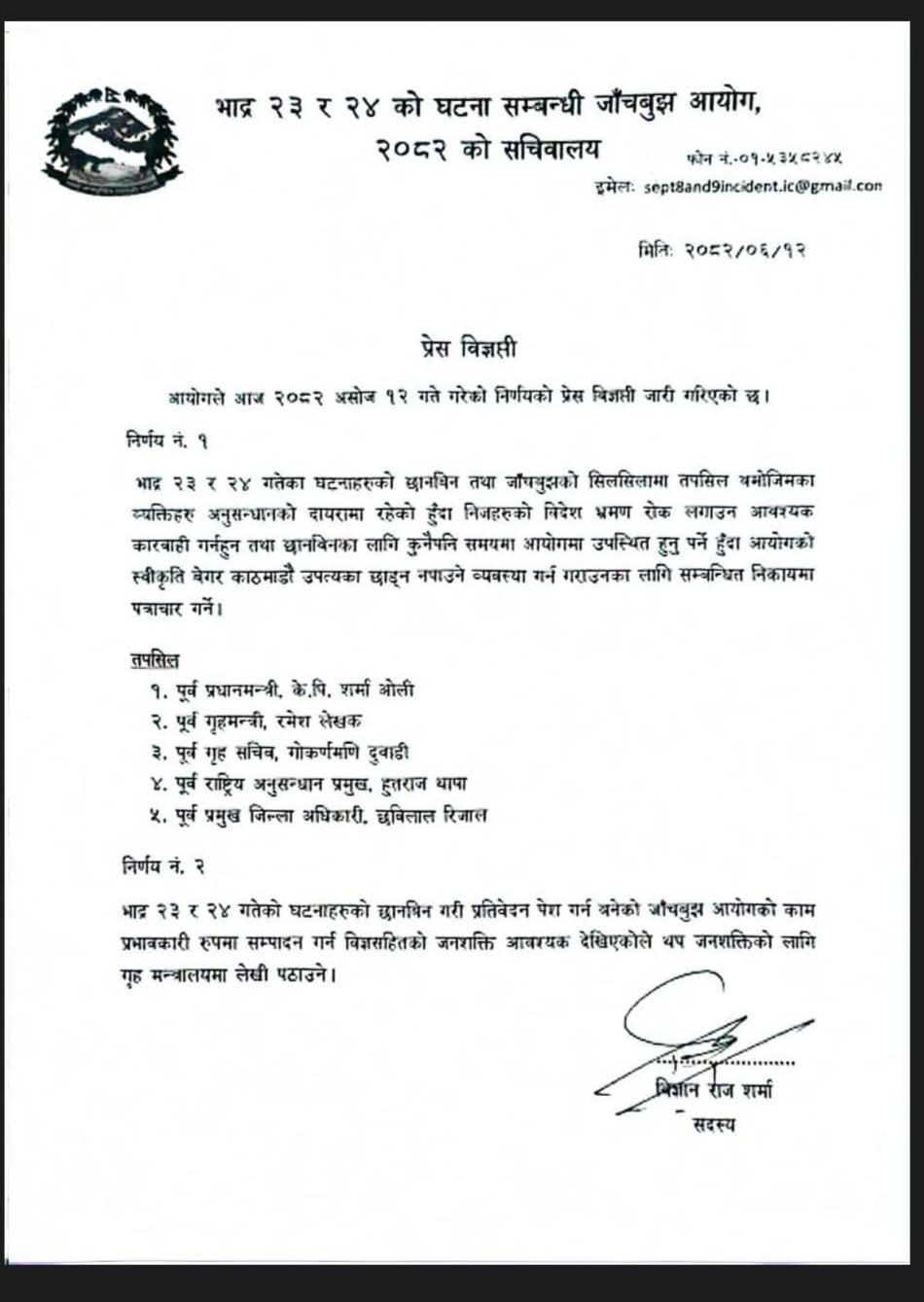 काठमाडौं । जेन–जी आन्दोलनको घटना छानबिनका लागि गठित जाँचबुझ आयोगले निवर्तमान प्रधानमन्त्री केपी शर्मा ओली र गृहमन्त्री रमेश लेखकसहित पाँच जनाको विदेश भ्रमणमा रोक लगाउन सम्बन्धित निकायमा सिफारिस गर्ने निर्णय गरको छ ।