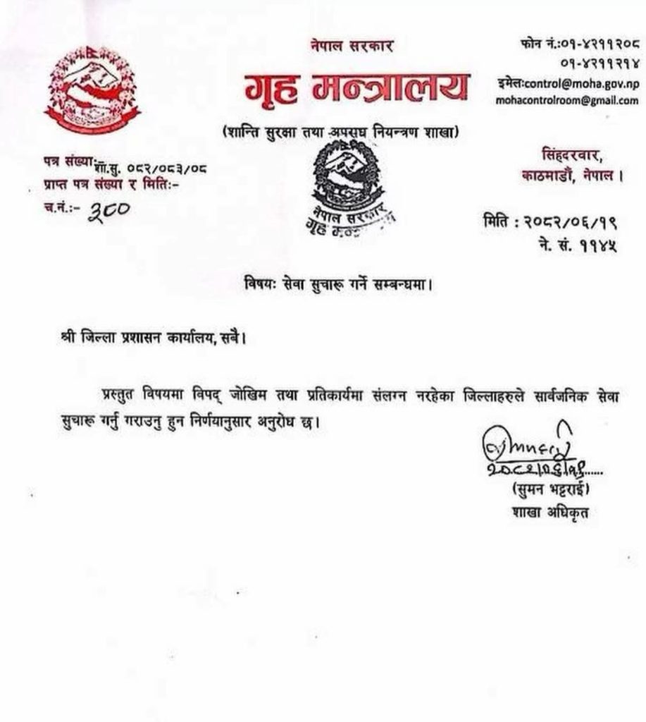 काठमाडौं । गृह मन्त्रालयले विपदको जोखिम नरहेका तथा प्रतिकार्यमा संलग्न नरहेका जिल्लाहरूमा सार्वजनिक सेवा सुचारु गर्न गराउन निर्देशन दिएको छ ।