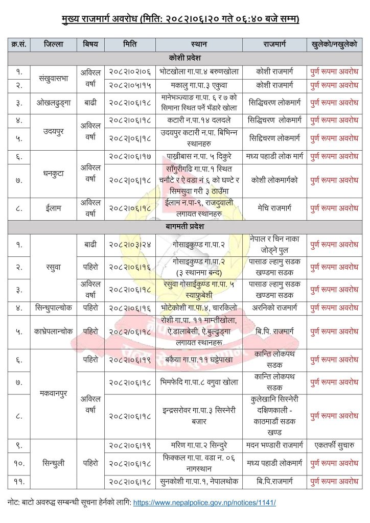 दक्षिणकाली–काठमाडौं खण्ड पनि इन्द्रसरोवर गाउँपालिका–३ सिस्नेरी बजार क्षेत्रमा बन्द भएको प्रहरीको जानकारीमा उल्लेख छ।