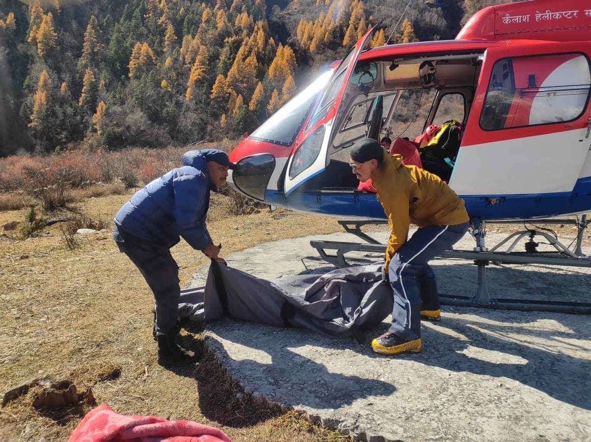 आरोहीहरूको शव हेलिकोप्टरमार्फत सामागाउँ ल्याइएको छ। विगत बुधबार पाङबारी हिमाल आरोहणका लागि गएका तीन इटालीयन नागरिक र एक नेपाली सहयोगी अलपत्र परेका थिए। फरिनातो र गापुटो हिमाल आरोहणमा असफल भएपछि फर्कने क्रममा हिमपातका कारण अलपत्र परेका थिए।