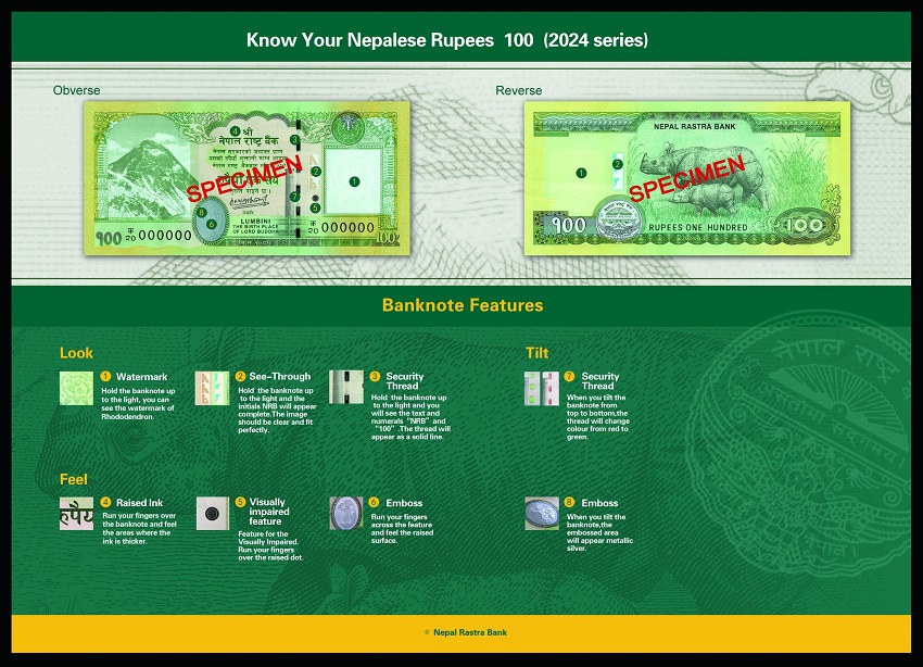 साबिककै आकार र रङमा आउन लागेको यो नयाँ नोटमा ‘नेपाल सरकारको जमानत प्राप्त यसको रुपियाँ भुक्तानी माग्न आएमा नेपाल राष्ट्र बैंकबाट १०० रुपैयाँ एक सय तुरुन्त पाइने छ’ सूचनामा उल्लेख छ ।