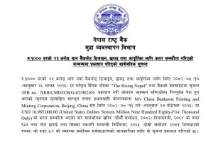 काठमाडौं । चीनको एक कम्पनीले नेपालको बैंक नोट छाप्ने ठेक्का पाएको छ। बैंक नोट छपाइ गर्न मिन्टिङ एण्ड प्रिन्टिङ कर्पोरेशनले ठेक्का पाएको हो । यो चीनको केन्द्रीय बैंक पिपुल्स बैंक अफ चाइनाको सहायक कम्पनी हो।