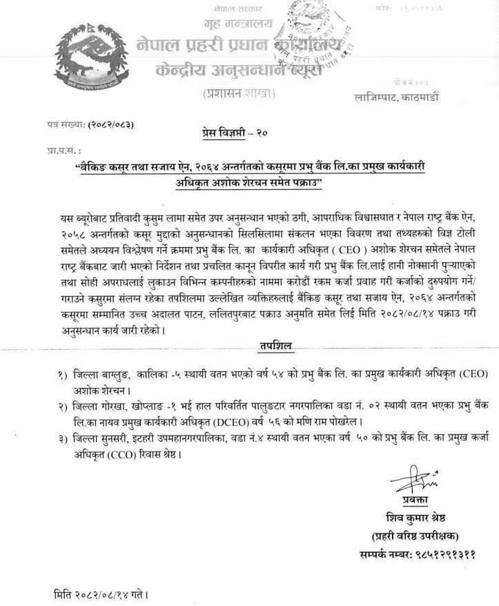 काठमाडौं । बैंकिङ कसुरको आरोपमा प्रभु बैंकका प्रमुख कार्यकारी अधिकृत (सीईओ) अशोक शेरचनसहित तीन उच्च पदस्थ अधिकारीलाई प्रहरीको केन्द्रीय अनुसन्धान ब्युरो (सीआईबी) ले पक्राउ गरेको छ।