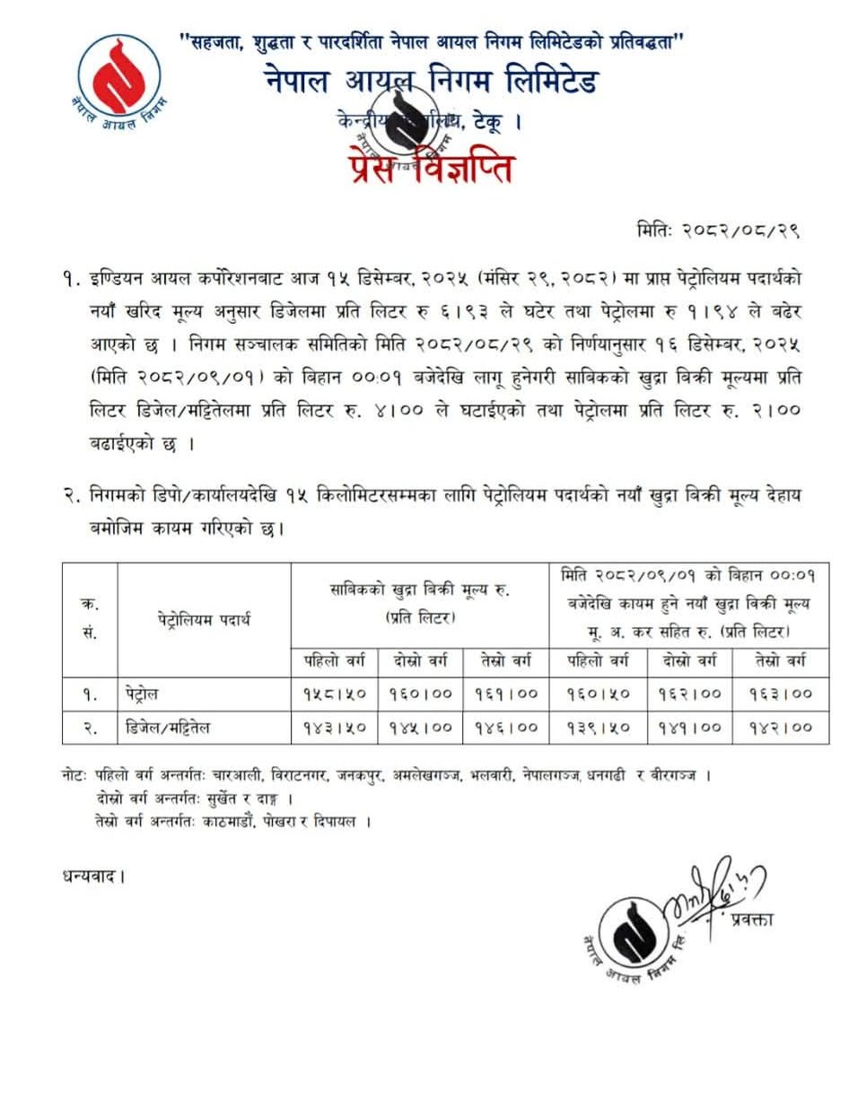 काठमाडौं । नेपाल आयल निगमनले आज रातिदेखि लागू हुने गरी पेट्रोलको मूल्य बढाएको छ भने डिजल र मट्टितेलको मूल्य भने घटाएको छ। निगमका अनुसार पेट्रोलमा २ रुपैयाँ बढाइएको हो भने डिजल र मट्टितेलमा ४ रुपैयाँ घटाइएको छ। समायोजन गरिएको मूल्य आज राति १ बजेबाट लागू हुने छ।