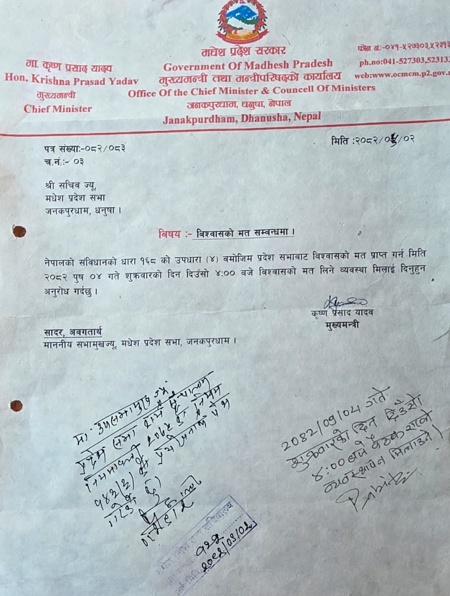 पत्रमा शुक्रबार अपराह्न ४ बजे विश्वासको मत लिने कार्यसूची तय गरिदिन अनुरोध गरिएको छ । प्रदेश सरकारको निरन्तरता र राजनीतिक समर्थन पुष्टि गर्न मुख्यमन्त्री यादवले प्रदेश सभामा विश्वासको मत लिन लागेको सचिवालय स्रोतले जनाएको छ ।