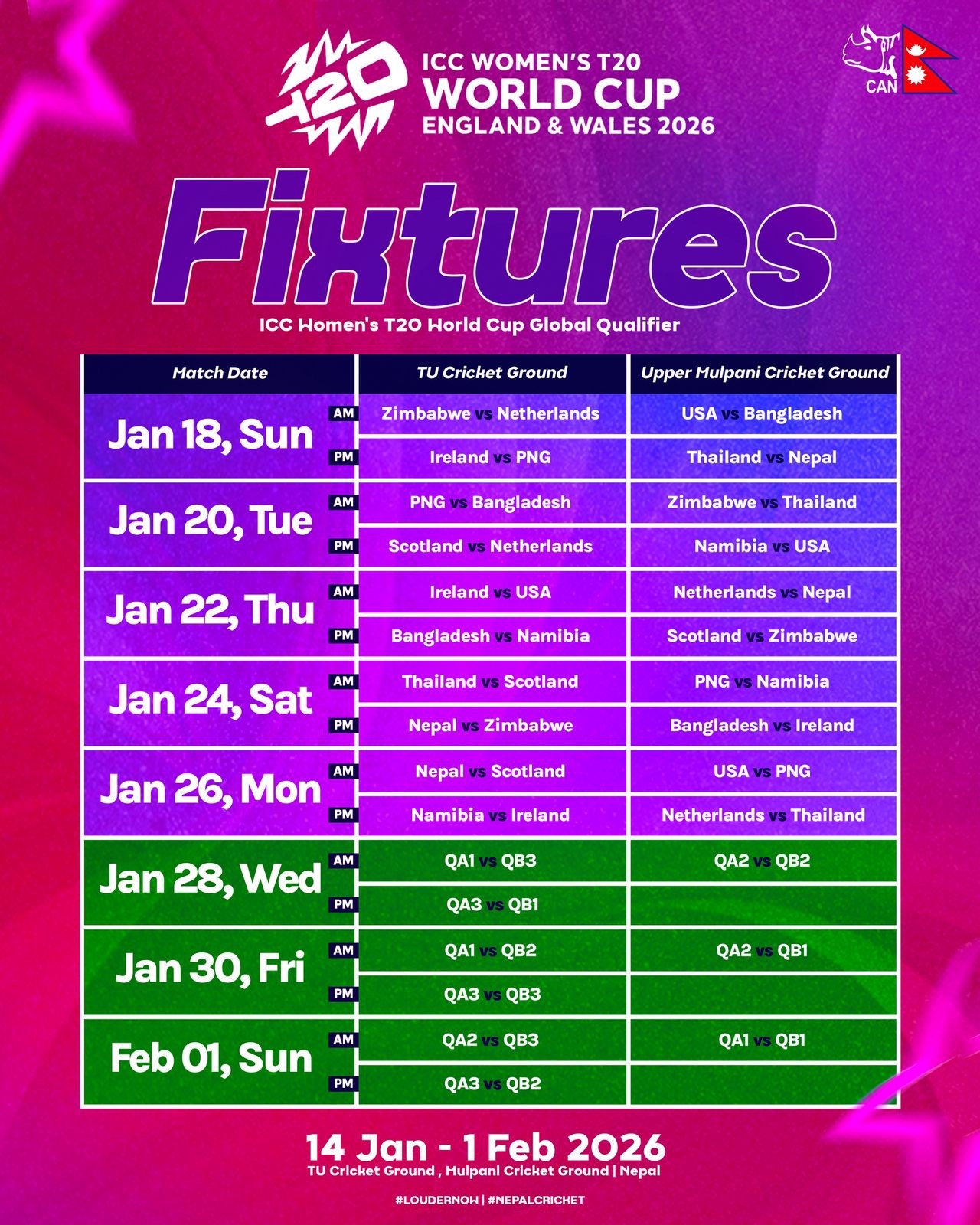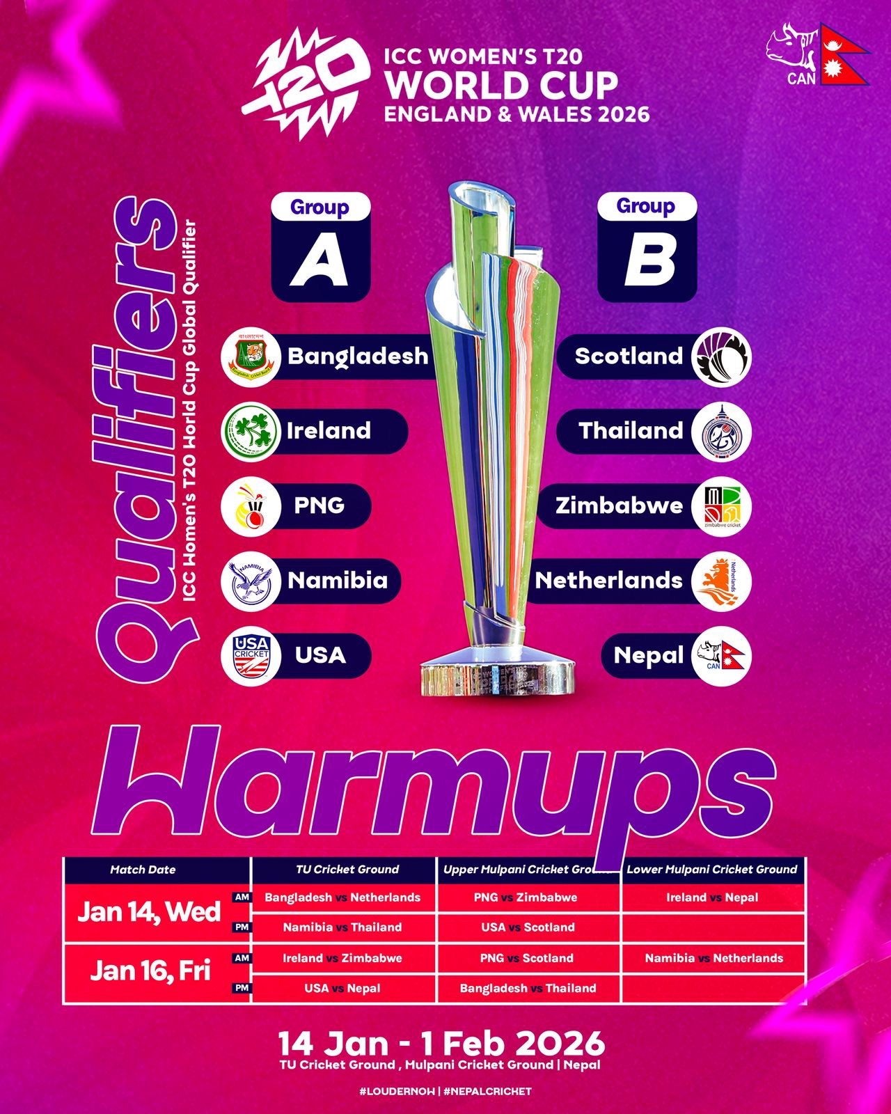 काठमाडौं । आईसीसी महिला टी–२० विश्वकपअन्तर्गतको ग्लोबल छनोटमा नेपालले पहिलो खेल थाइल्यान्डविरुद्ध खेल्ने भएको छ। घरेलु मैदानमा आयोजना हुने छनोट प्रतियोगितामा नेपालले माघ ४ गते थाइल्यान्डसँग प्रतिस्पर्धा गर्नेछ।